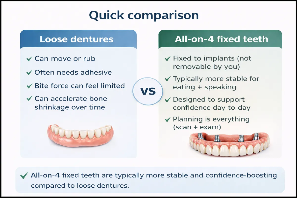 Dentures can work well for some people — but they sit on the gums. All-on-4 is anchored to implants, so it can feel more secure.