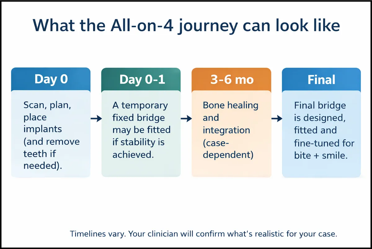 Most clinics mean you may leave with a fixed temporary bridge on the day of surgery. It’s designed for healing — not maximum bite force. The final teeth usually come later after the implants integrate.