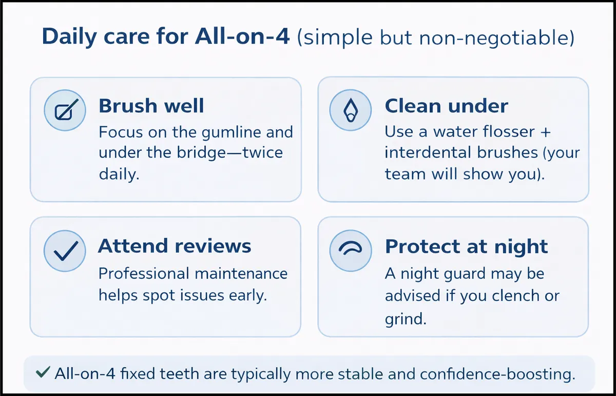 All-on-4 can be life-changing — and it still needs maintenance like a high-performance car. Your job: daily cleaning + protect it from extreme biting. Our job: check-ups, professional hygiene, and making sure the bite stays balanced.